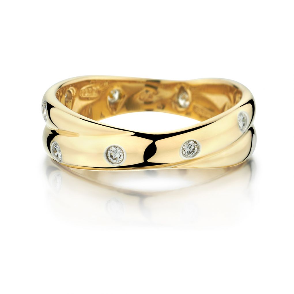 Ladies 18kt yellow gold and platinum Tiffany and company etoile criss cross band featuring 0.31 carat total weight of Round Brilliant cut diamonds of (VS) in clarity and (F-G) in color. Diamonds going all the way around. Finger size 10 and cannot be resized. Circa 1990. 7.2 grams in weight.