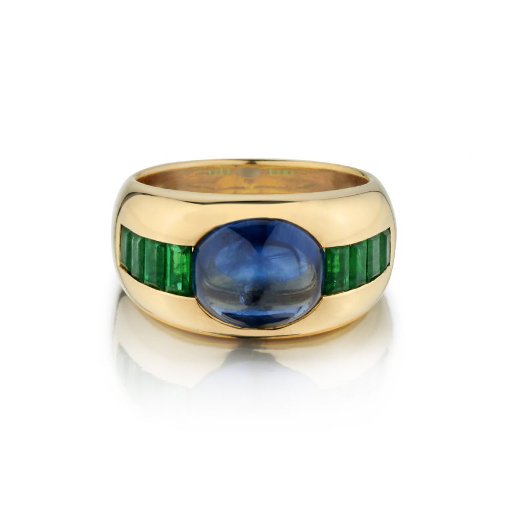 Unisex 18kt Y/G Cabochon Blue Sapphire and Green Emerald Ring.