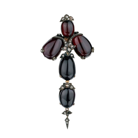 Beautiful Victorian Garnet and Diamond Pendant/Brooch in silver. This piece features 5 large Cabochon Garnets. Also featuring Mine and Rose cut diamonds . Circa 1840. Gross weight: 21.65 grams. Measuring:3" (L) x 2"(W). All original. Beautiful patina.