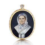 Ladies handmade and hand-painted Victorian-era 14kt yellow gold cameo pendant displaying a portrait of a lady wearing a bonnet with intricate detail. This portrait is painted on tortoise shell which can be seen when flipped around. 3 1/4" in length. Circa 1800's (+/-).