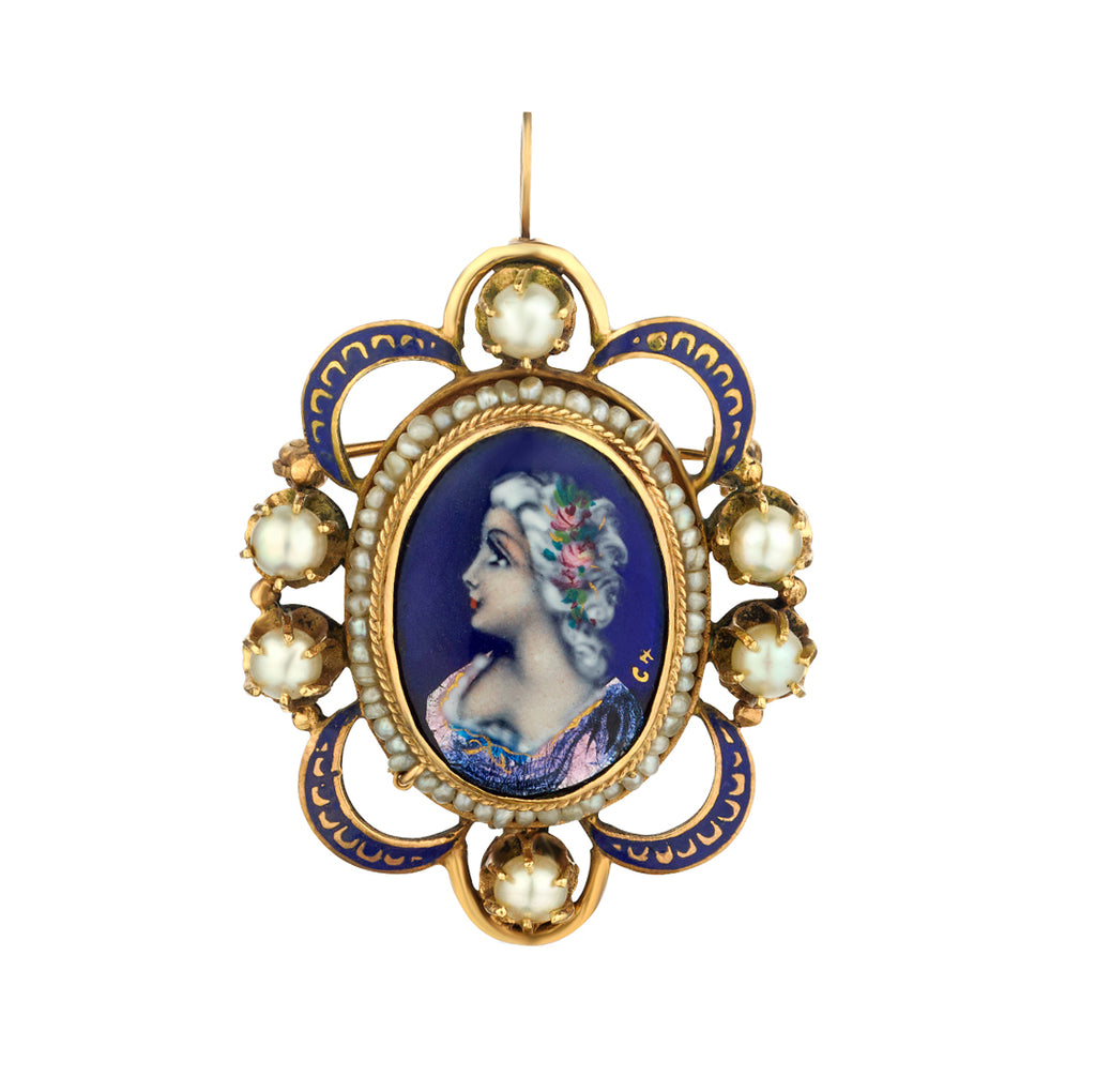 • Vintage Baroque Pearl and Enamel Lady Portrait Brooch / Pendant. 14kt Y/G