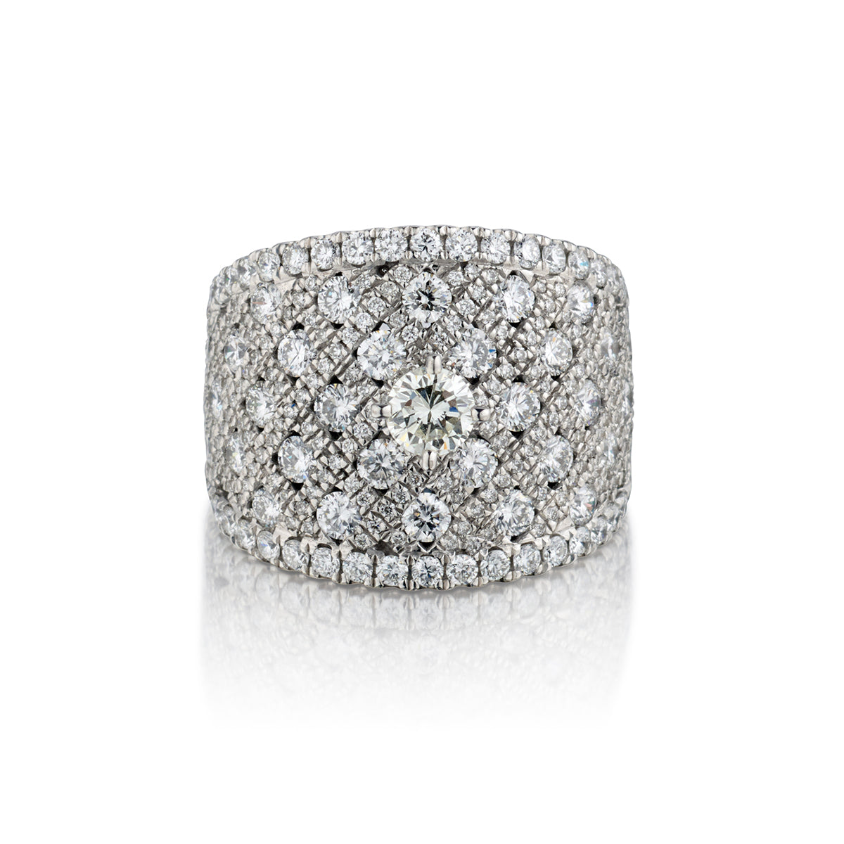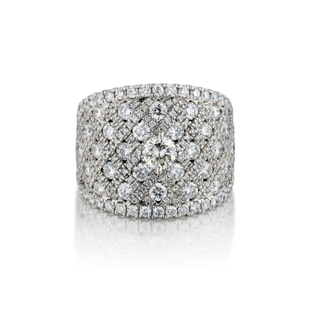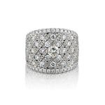 Ladies 18kt white gold wide and impressive diamond engagement ring featuring a Brilliant cut diamond weighing 0.30 carat weight   of (VS ) in clarity and (G) in color. The Brilliant cut diamond is featured on a band set with Round Brilliant cut diamonds weighing 2.55 carat total weight of (VS) in clarity and (G) in color. Currently a size 7 but can be resized. Measuring:18mm x 22mm.