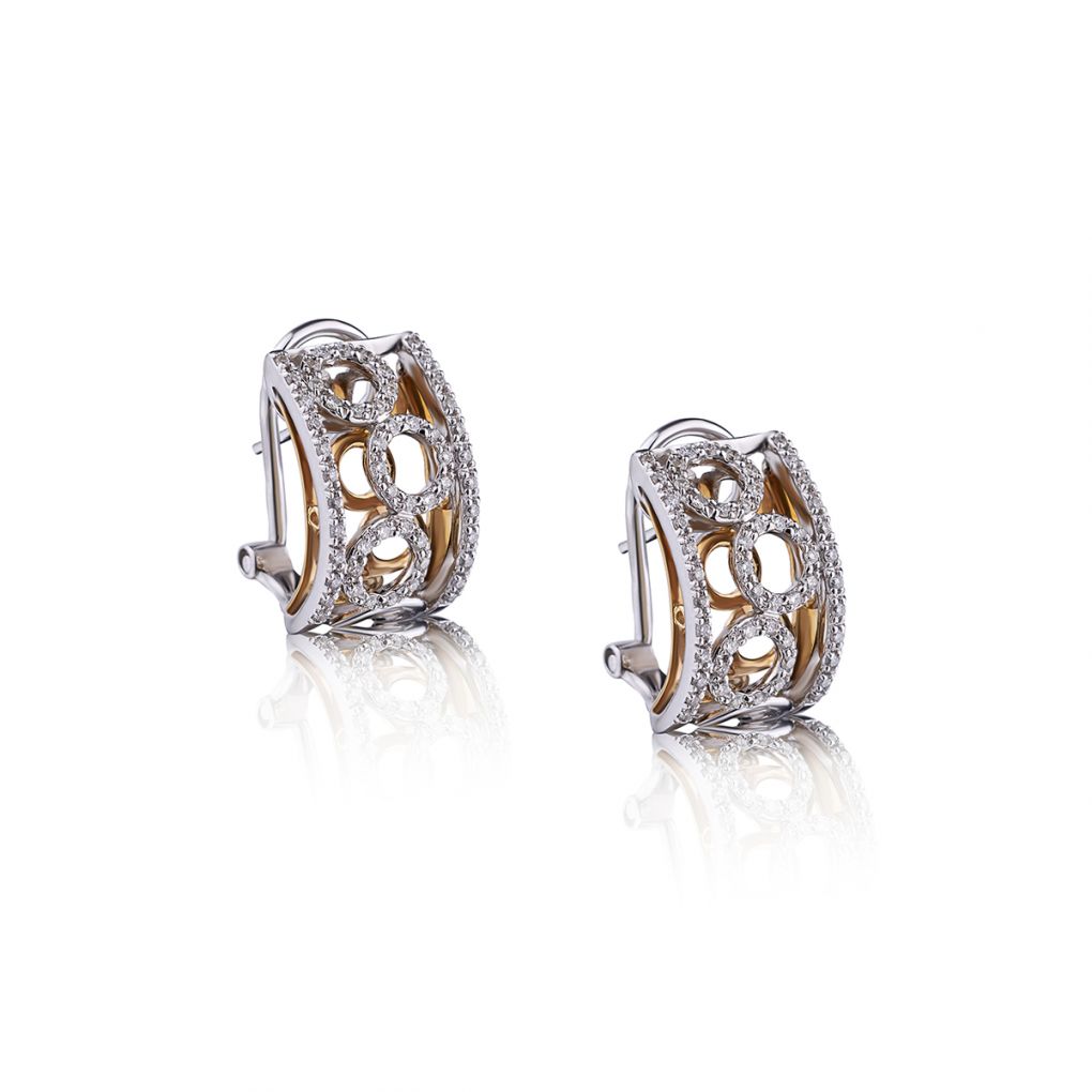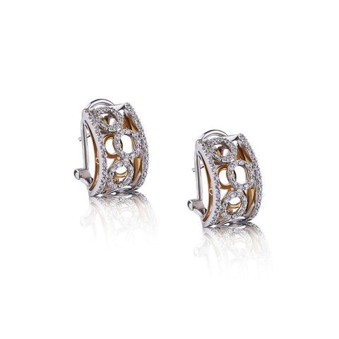 Ladies 18kt yellow and white gold diamond hoop earrings featuring 0.50 carat total weight of Round Brilliant cut diamonds. Diamonds set in white gold with yellow gold circles as back drop. Post and omega backing. 19mm x 11mm. 8.73 grams in weight.