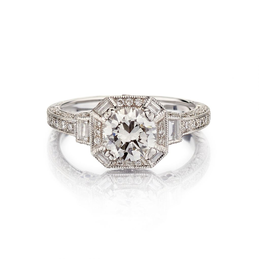 Ladies 18kt white gold vintage-inspired engagement ring featuring a 0.93 carat Round Brilliant cut diamond of (SI-2) in clarity and (J) in color. Further enhanced by 0.52 carat total weight of Round Brilliant cut and Baguette cut diamonds. Beautiful milled-edge and detailing. Currently a finger size 6 but can be resized. Signed BK Jewellery.