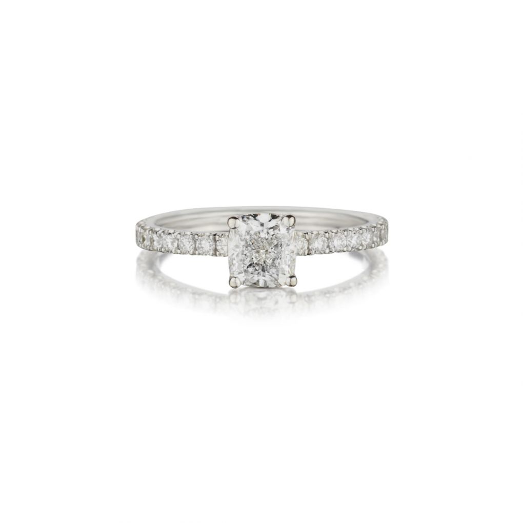 Ladies 18kt white gold diamond engagement ring featuring a 1.00 Carat GIA-Certified Cushion cut diamond of (VS-1) in clarity and (H) in color. The band featuring (22) Round Brilliant cut diamonds weighing 0.40 carat total weight of (VS-SI) in clarity and (G-H) in color. Currently a finger size 6 1/2 but can be resized.