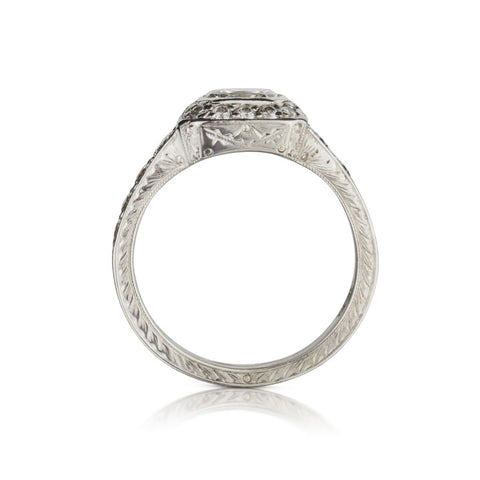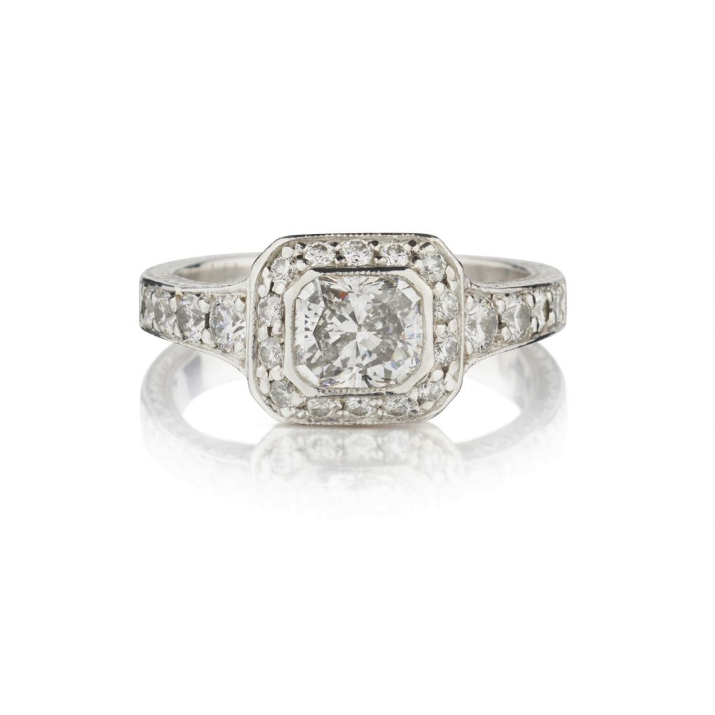 Ladies platinum bezel-set 1.01 Carat GIA Certified Radiant cut diamond of (VS2) in clarity and (D) in color, surrounded by a halo of Round Brilliant cut diamonds and diamonds along the band weighing 0.70 carat total weight of (VS) in clarity and (E-F) in color. The ring is hand-carved with an antique design on the top and the sides of the shank of the ring. Currently a finger size 6 1/2 but can be resized.