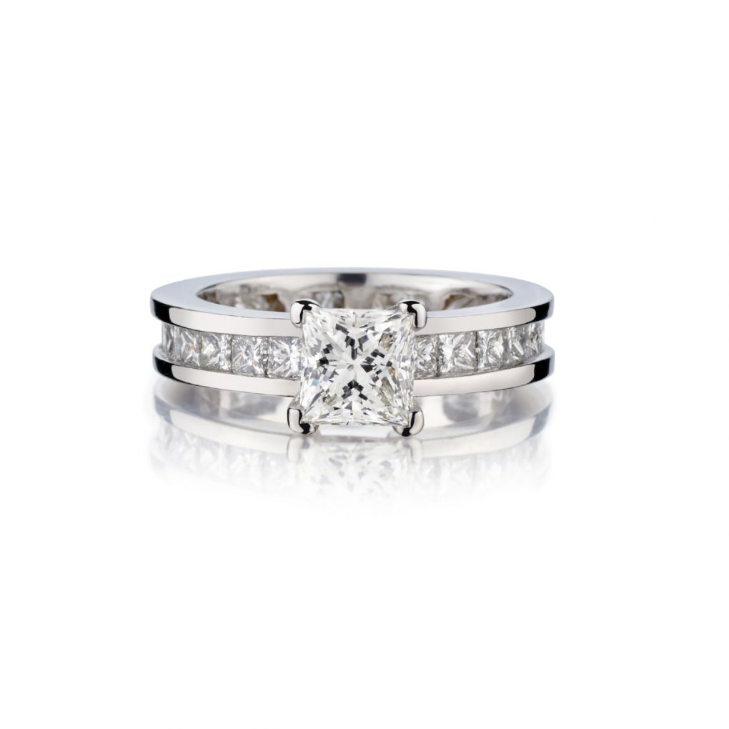 Ladies platinum diamond engagement ring featuring a 1.02 carat Princess cut diamond of (SI-2) in clarity and (G) in color. Further enhanced by 1.00 carat total weight of Princess cut diamonds going all the way around the band. Currently a finger size 4 1/2 and cannot be resized.