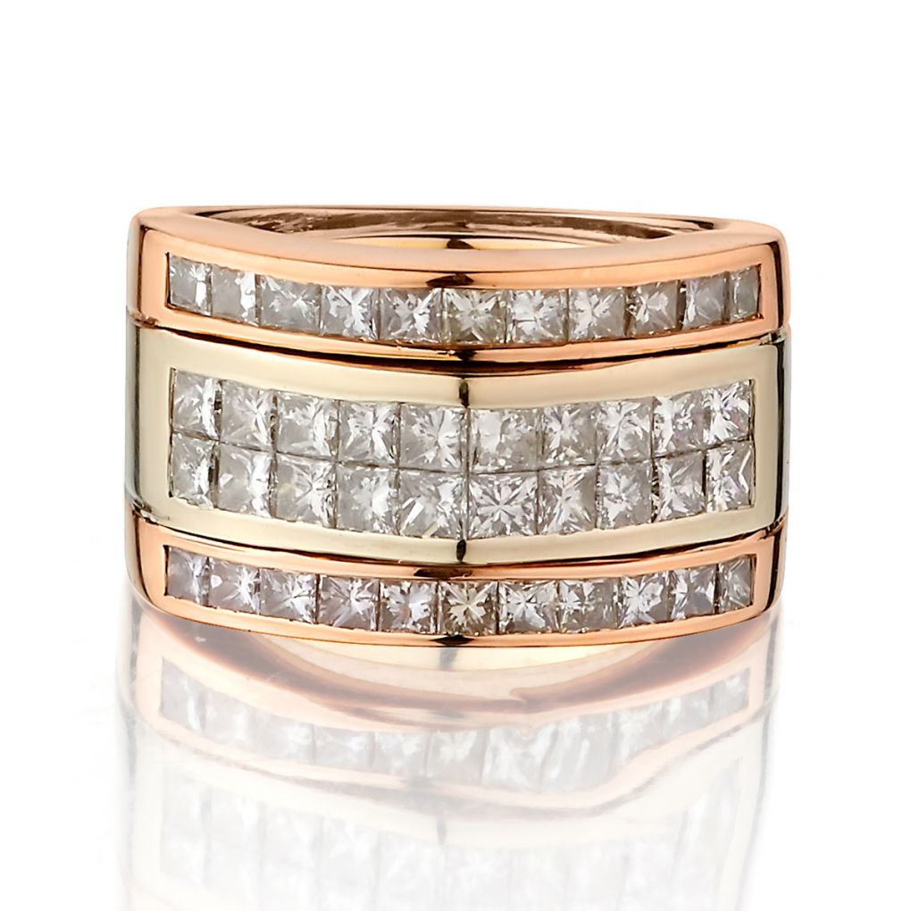 Ladies 18kt rose and white gold diamond band invisibly set with 1.50 carat total weight of Princess cut diamonds of (SI) in clarity and (I-J) in color. Currently a finger size 6. It can be resized.  12.2 grams in weight. 11mm (W).