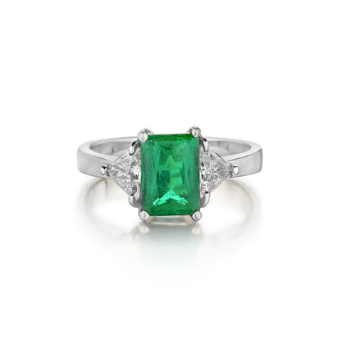 Ladies 18kt white gold dress ring featuring a 1.54 carat Green Emerald of strong slightly bluish green color and moderately included in clarity. Further enhanced by (2) Trillian cut diamonds weighing 0.67 carat total weight of (VS-SI) in clarity and (K-L) in color. 4.90 grams in weight. Currently a finger size 7 but can be resized.