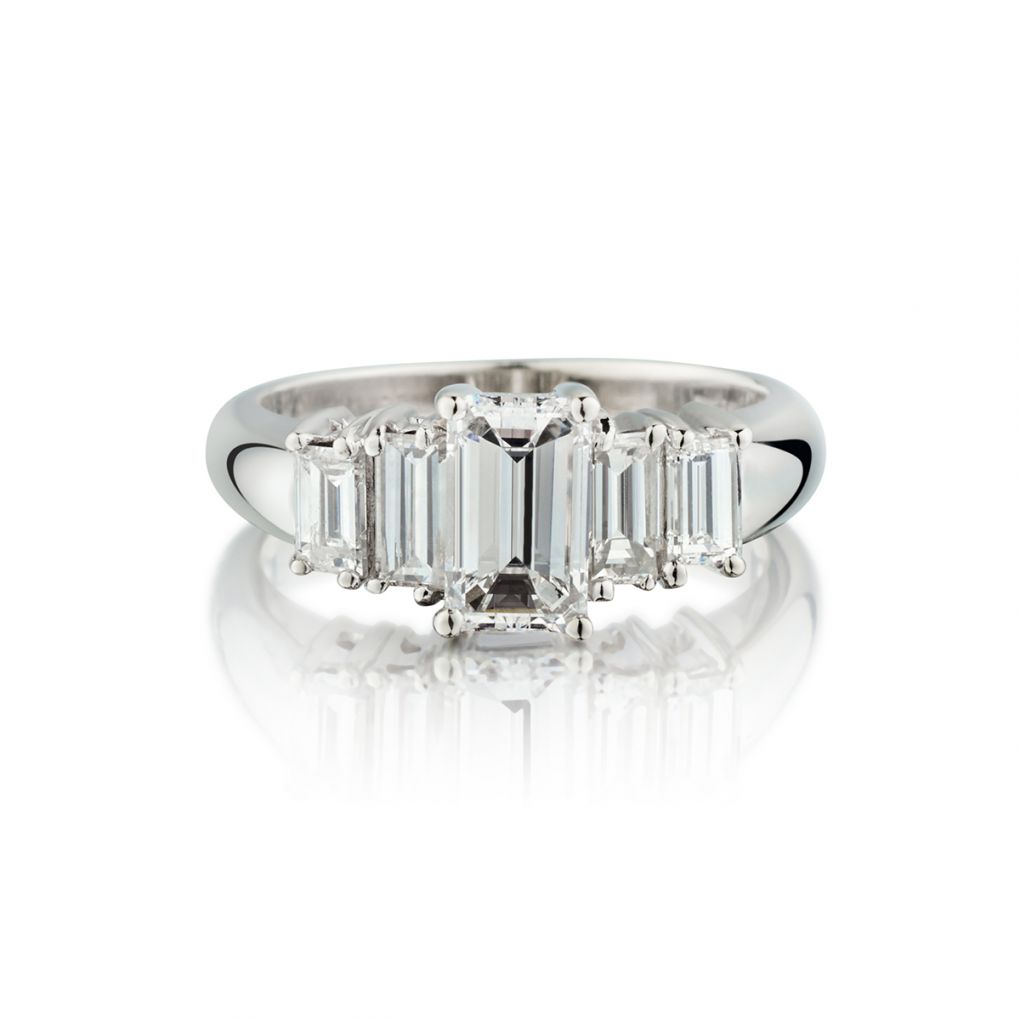 Ladies 18kt white gold diamond engagement ring featuring a 1.01 carat Emerald cut diamond of (VVS) in clarity and (F) in color; flanked between (4) Emerald cut diamonds weighing 0.65 carat total weight of (VVS) in clarity and (F) in color. Currently a finger size 6 but can be resized.