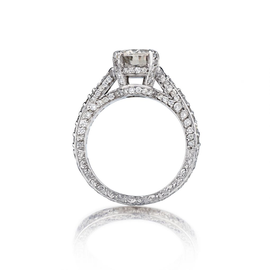 Ladies 18kt white gold diamond engagement ring featuring a 1.75 carat Old-European cut diamond of (SI-2) in clarity and (O-P) in color. The setting is custom made with multiple brilliant cut diamonds set on 3 sides. Diamonds going all the way around. Finger size 6 1/2 and cannot be resized.
