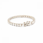 Ladies spectacular 18KT white gold diamond bracelet featuring (38) round Brilliant-cut diamonds in a 3-prong Martini setting, weighing approximately 10.60 carat total weight of (VS) in clarity and (F-G) in color. This magnificent diamond bracelet features a magnificent "X" flower-like clasp featuring (4) marquise-cut diamonds.