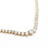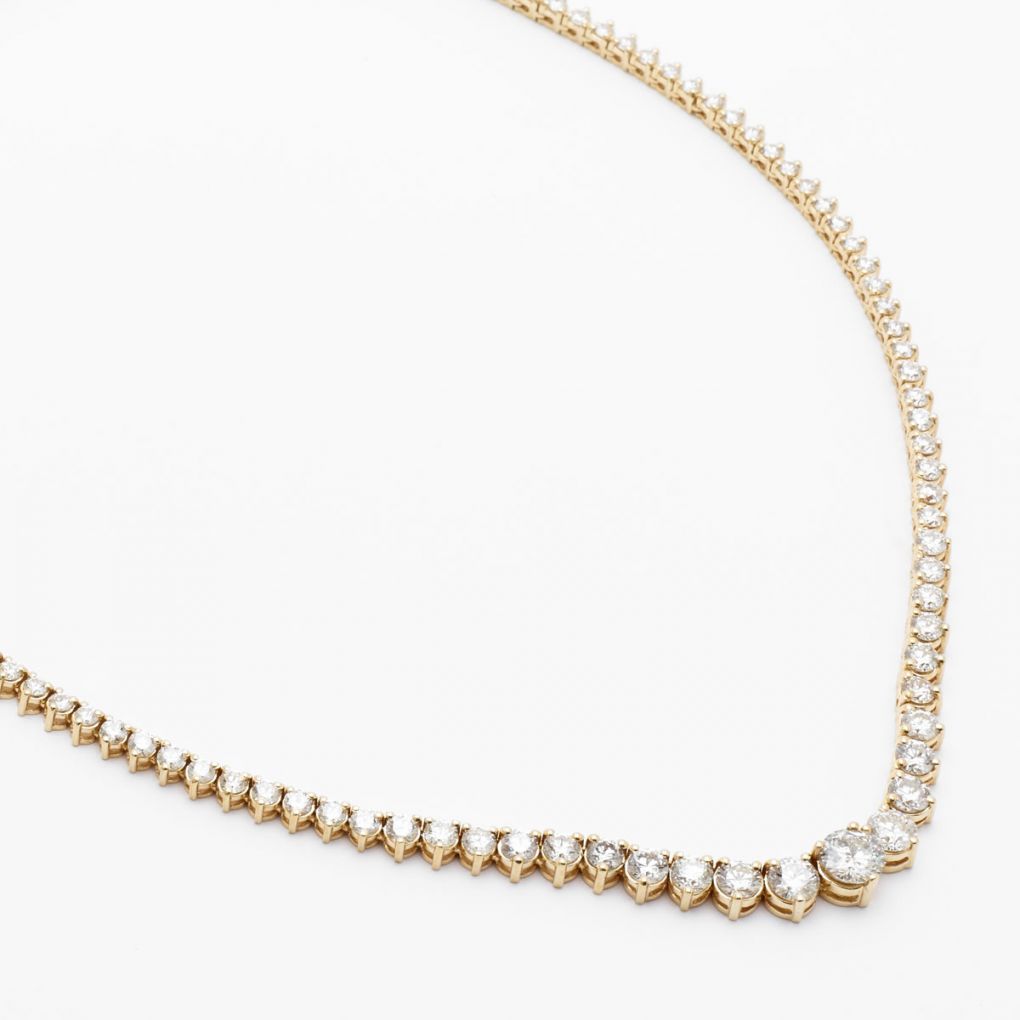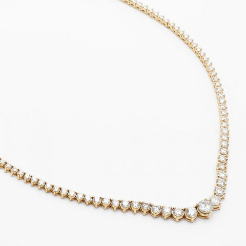 Ladies 14KT yellow gold diamond riviera necklace featuring graduated, three-prong round brilliant-cut diamonds weighing 11.00 carat total weight of (SI) in clarity and (I-J-K) in color.