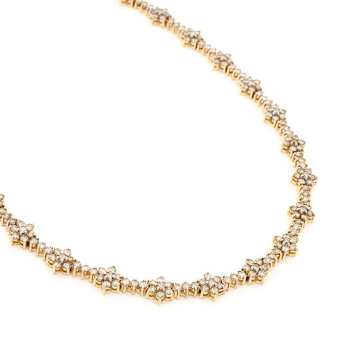Ladies 10KT yellow gold diamond flower necklace featuring 280 round brilliant cut diamonds weighing approximately 14.00 carats total weight of (I-1/I-2) in clarity and (O-P) in color. The necklace weighs 33.87 grams.