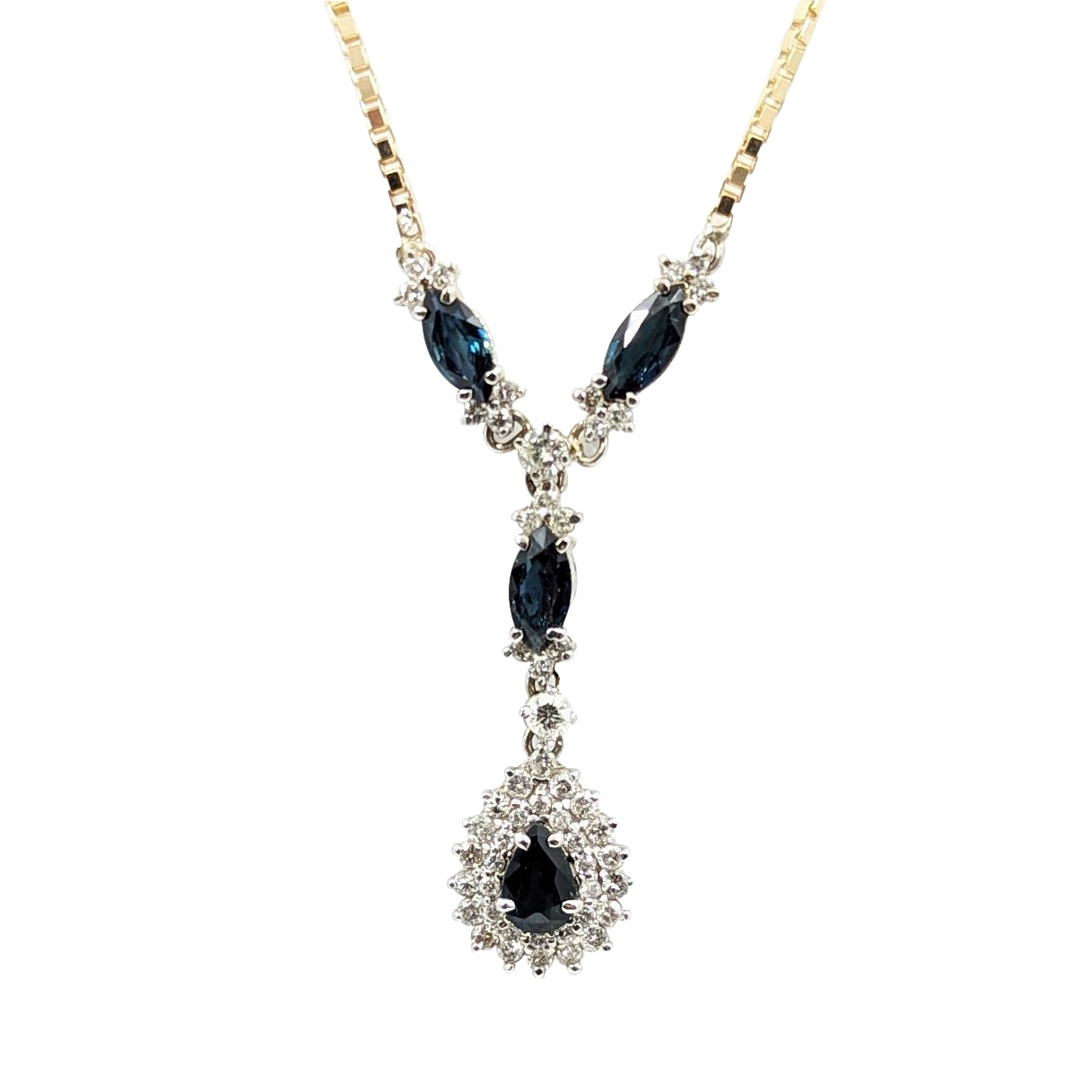 Lovely 14kt white gold chandelier style drop earrings set with 1.25ct total weight of diamonds and 2.50ct blue Sapphire. The earrings measure 36mm in length and are secured with a post and butterfly.