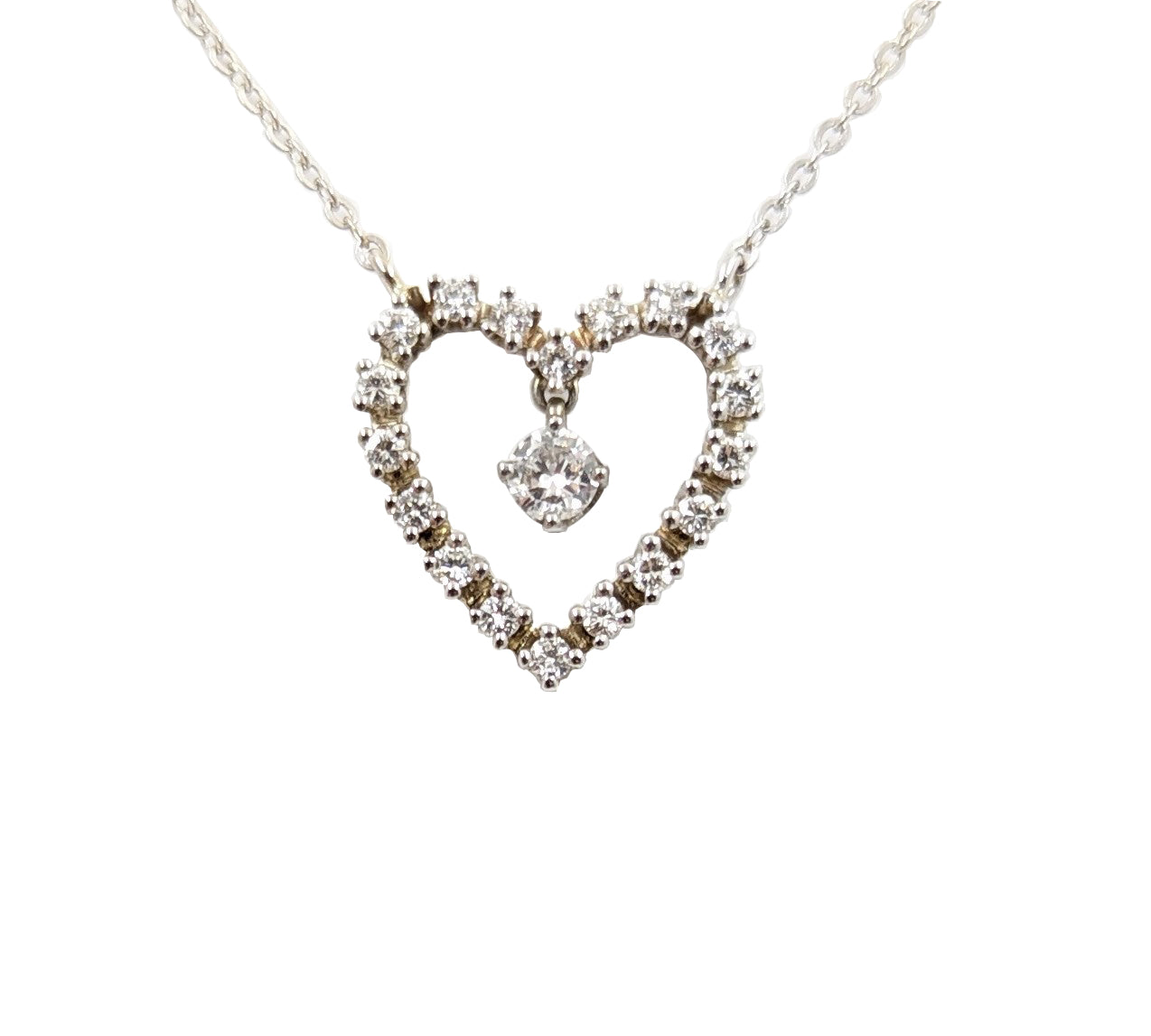 14kt white gold diamond pendant set with 18 x 0.65ct Tw round modern brilliant cut diamonds and there is a moveable single 1 x 0.25ct round modern brilliant cut diamond all having a VS clarity and G in colour.
