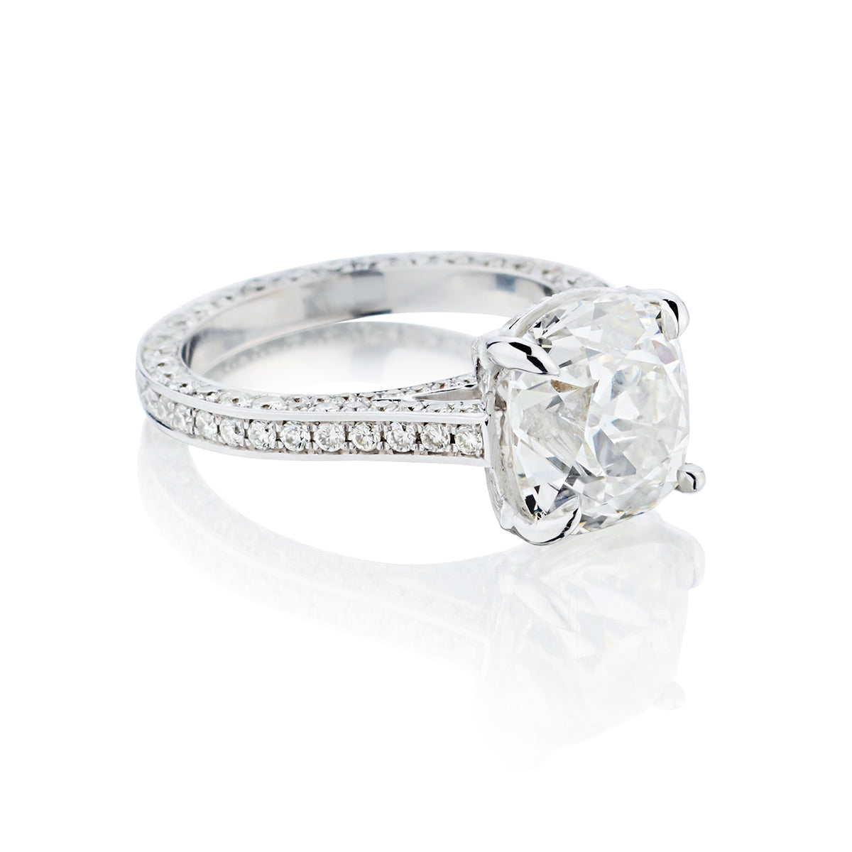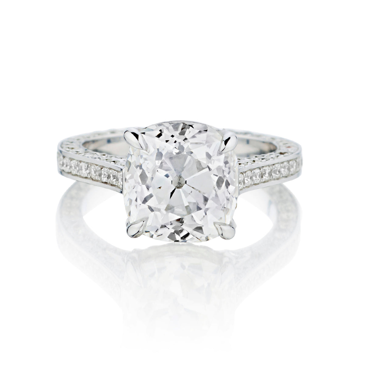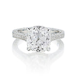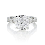 • 14kt White Gold Diamond Ring. 4.35 Handcut Natural Cushion Cut
