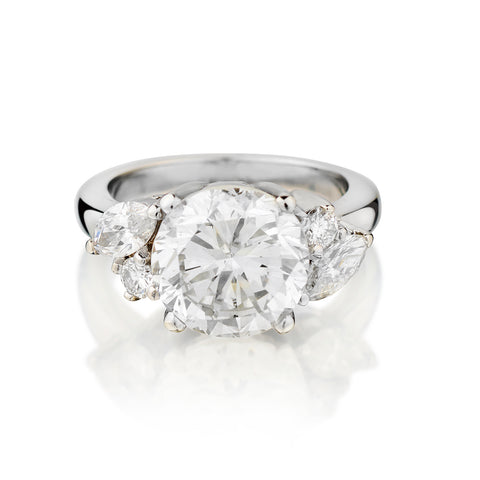 14kt white gold diamond ring. This ring features a Brilliant cut diamonds weighing 5.20ct carat weight of (SI-2) in clarity and (K) in colour. Also featuring 2 x 0.75 total carat weight of Marquise cut diamonds and 2 x 0.20 total carat weight of Brilliant cut diamonds. Current finger size: 6-1/2. This ring can be resized. Weight: 8.07 grams.
