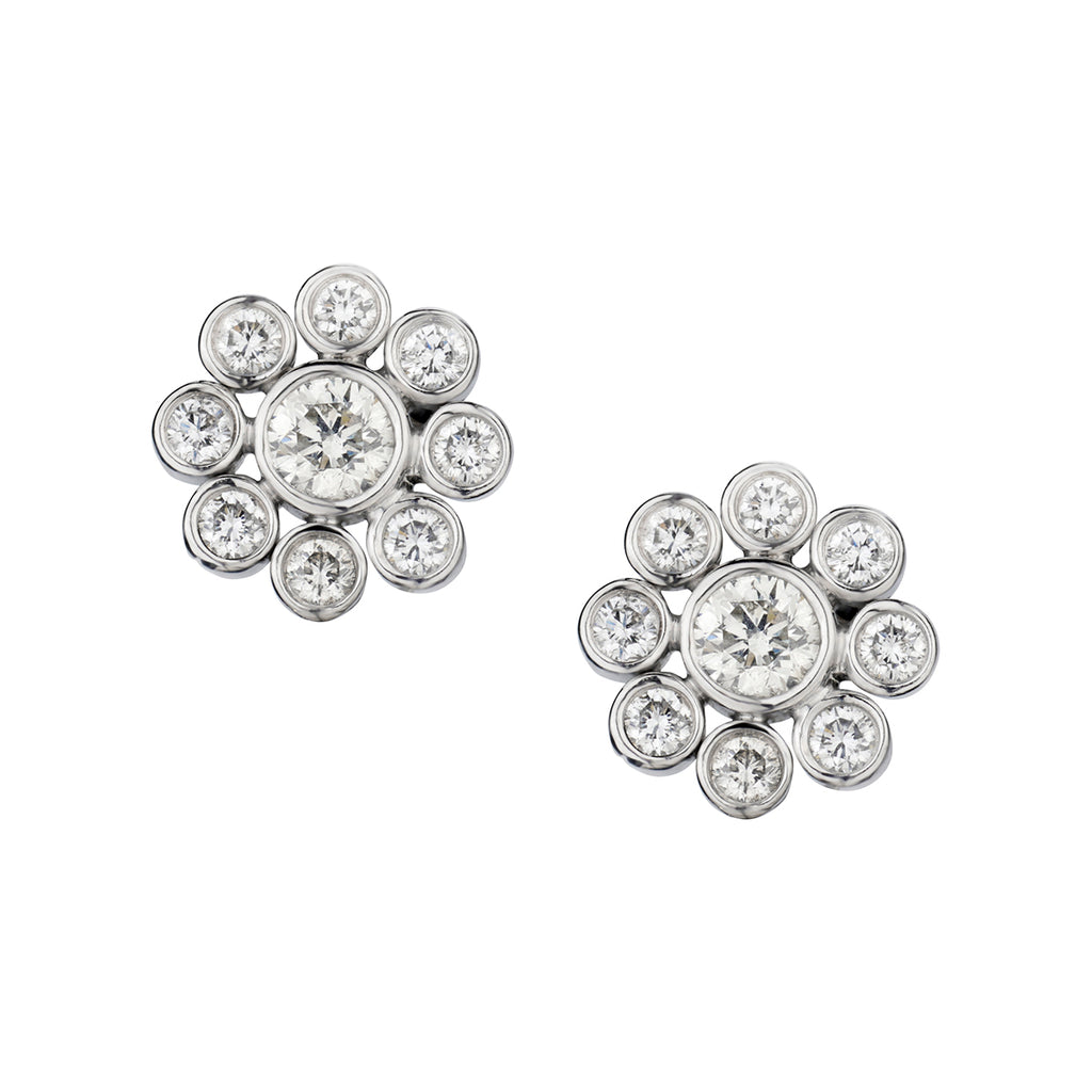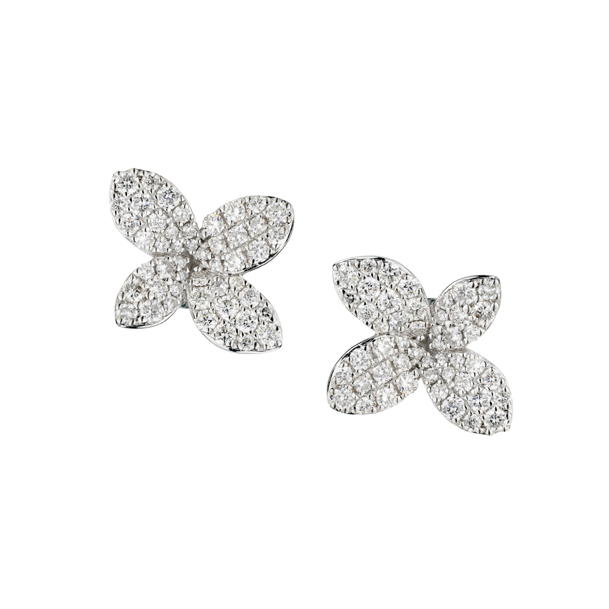 Ladies 14kt white gold diamond stud earrings. These earrings feature 16 x 1.20 total carat weight of Brilliant cut diamonds of (SI) in clarity and (G-H) in colour. Measuring 11mm. Post and butterfly closure.