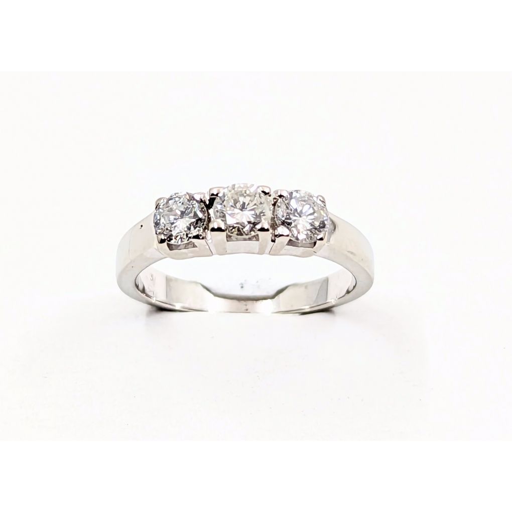 14kt white gold 3 stone Trinity ring .Featuring a Rrilliant cut diamond weighing  0.22 carat weight. Also 2 x o.40 total carat weight of Brilliant cut diamonds of  (J) in colour and I-1 in clarity.
