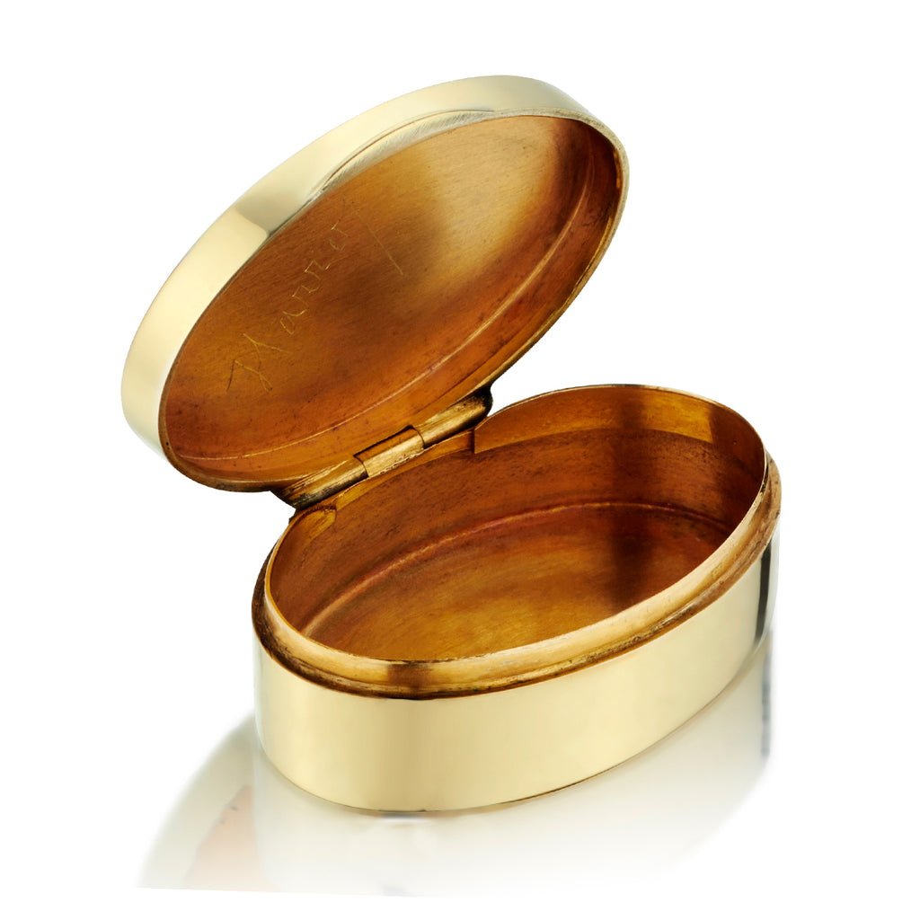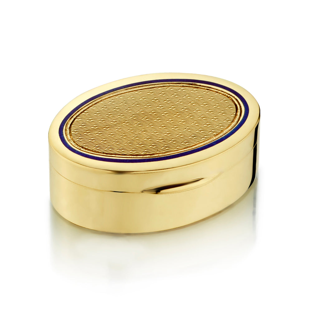 14kt yellow gold oval vintage pillbox. Blue enamel rim. Guilloche design on top and bottom of the box. 37mm x 24mm x 13mm (h). Weight: 18.5 grams. Circa :1940's. Rare find.