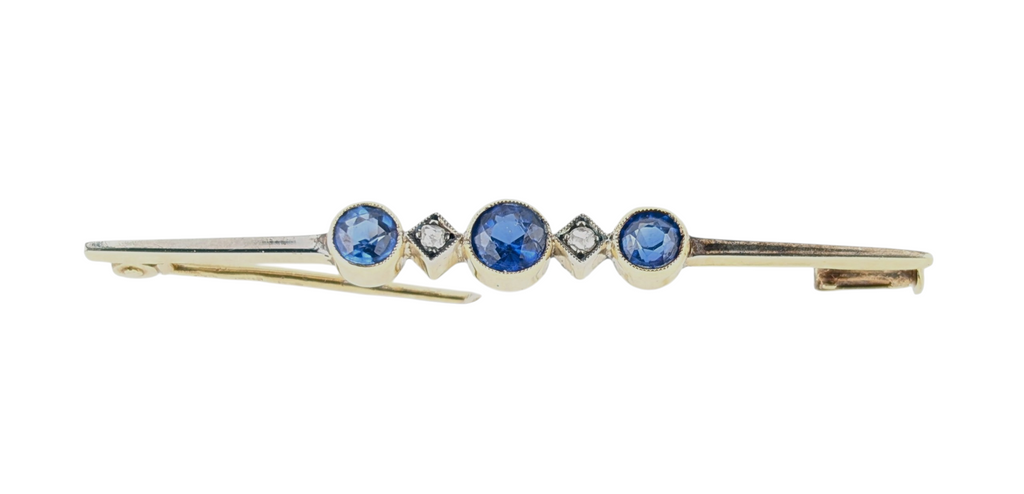 14kt yellow gold Sapphire & Diamond brooch featuring 3 bezel set Sapphires and 2 rose cut Diamonds. Measures at 2 inches in width.