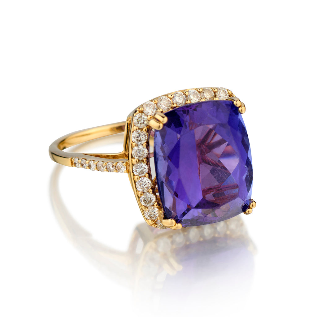 14kt yellow gold ring featuring a cushion shaped faceted Tanzanite stone weighing 10.00 carat weight. Good cut. The centre stone is surrounded by a halo of 38 x 0.70 total carat weight of Brilliant cut diamonds of (I-1-2) in clarity and (G-H) in colour. Weight: 6.3 grams.