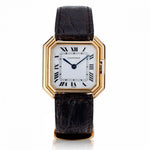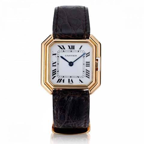 Cartier Paris Ceintuire wristwatch is 18kt yellow gold. Ultra slim.Circa 1980. 28mm x28 mm case size. White dial with roman numerals. Manual winding.Sapphire crystal. 17 jewels. Brown leather band with 18kt yellow gold Cartier deployant buckle.