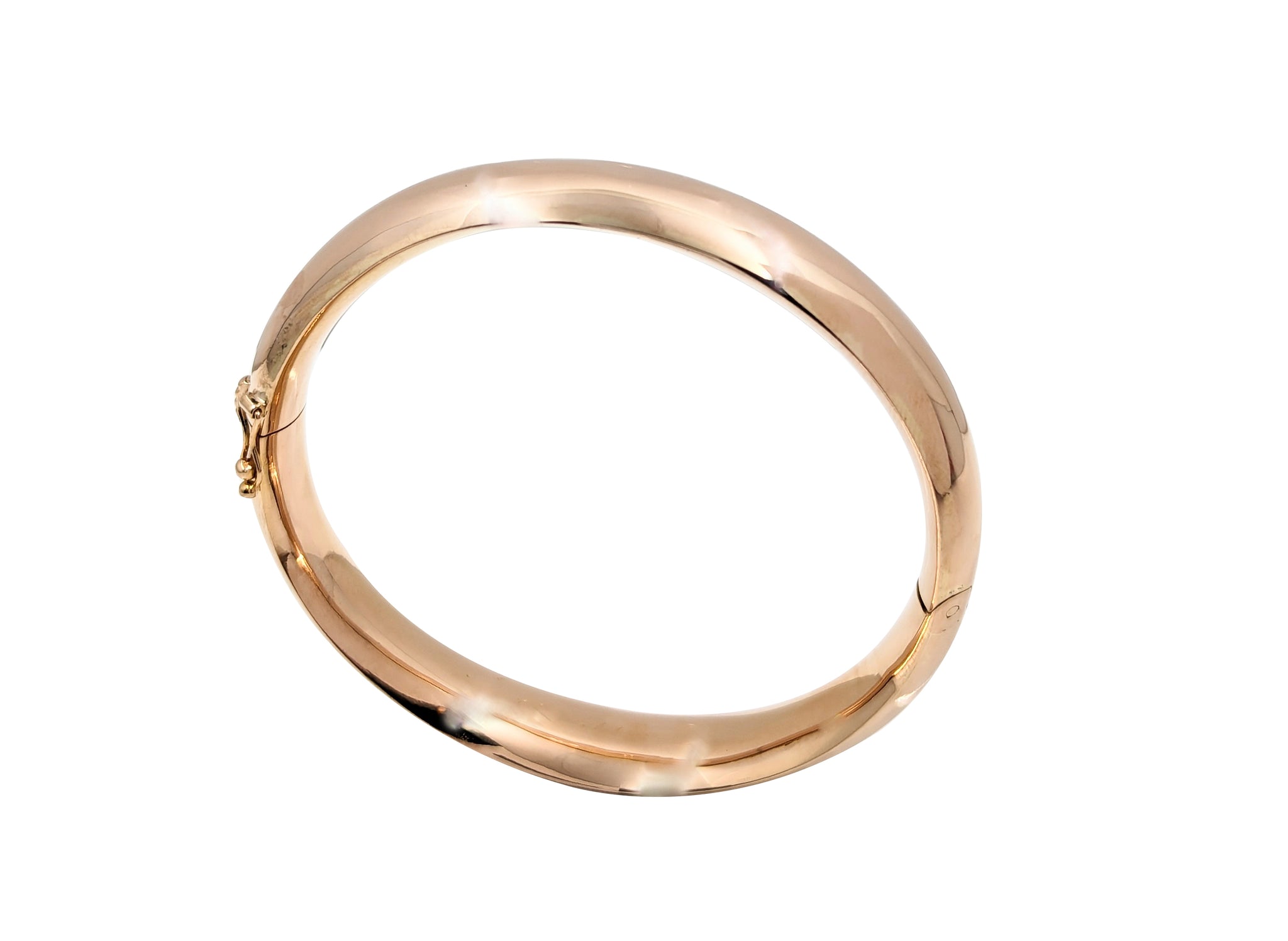 18kt rose gold bangle. Round in shape with hinged clasp. Rounded comfy fit on inside. Weight: 14.18 grams.  Measuring 10mm (W). Small size. Inside diameter: 49mm.