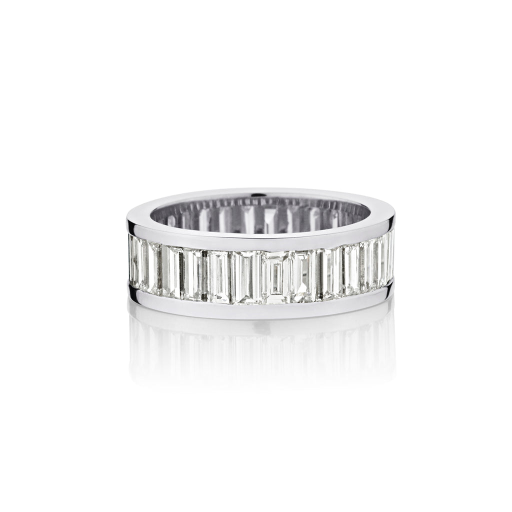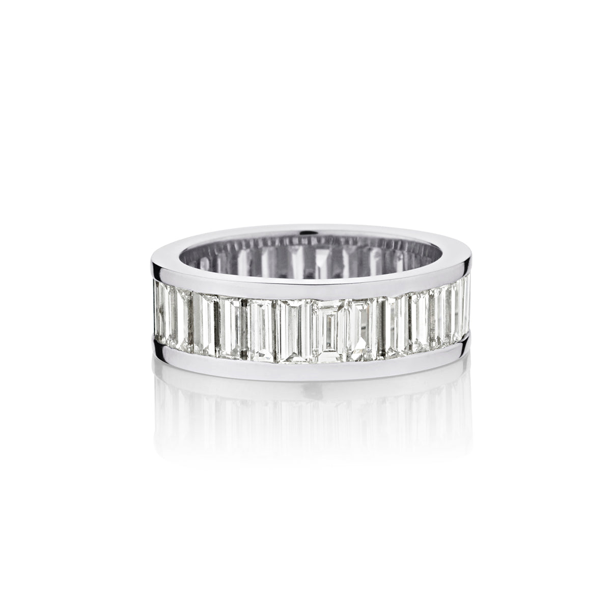 18kt white gold diamond band featuring 30 x 3.59 total carat weight of Baguette cut diamonds of (VVS-VS) in clarity and (E-F) in colour. Excellent cut. These diamonds are set in a channel setting all the way around. 6mm (W). Current finger size: 5. This ring cannot be resized.