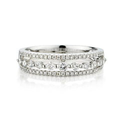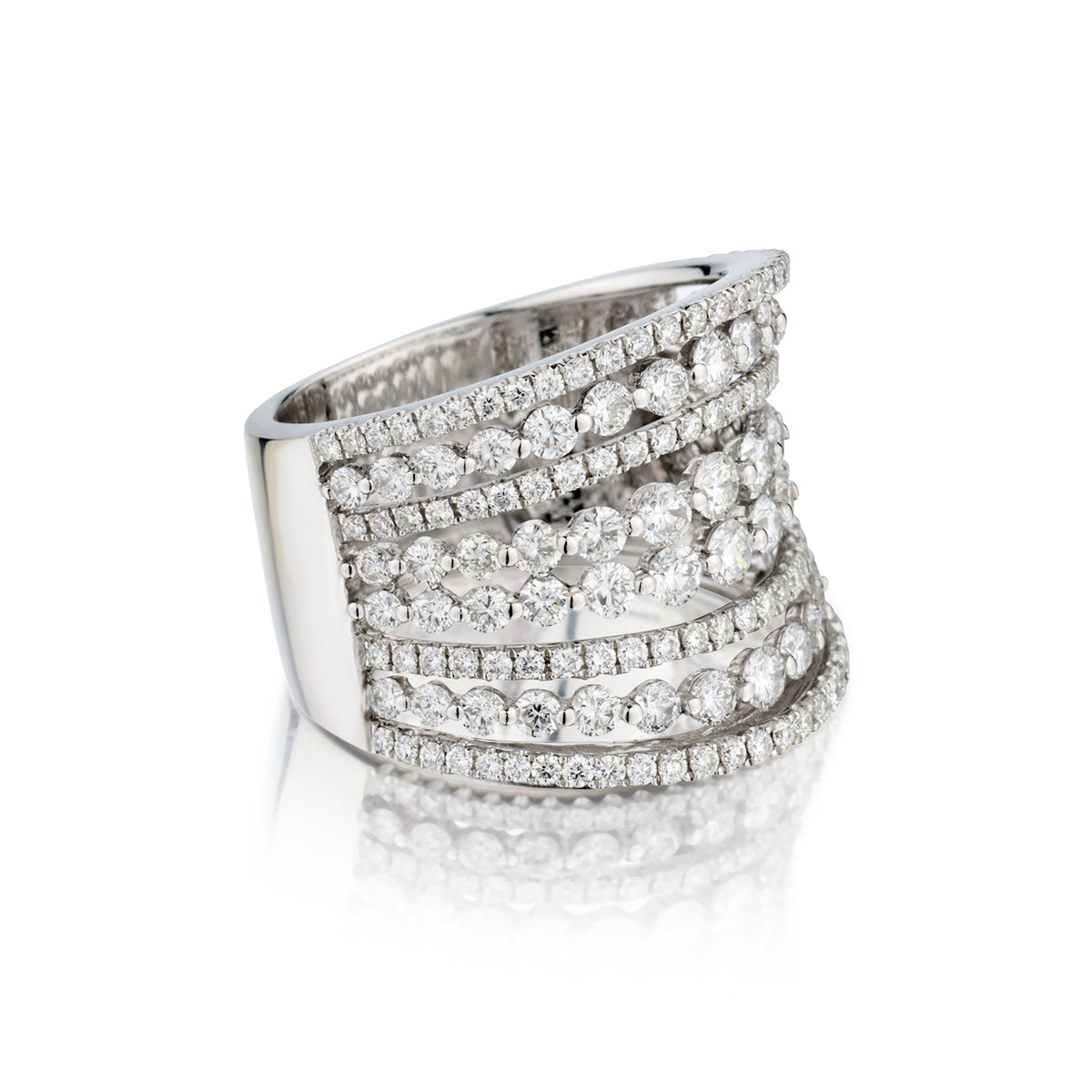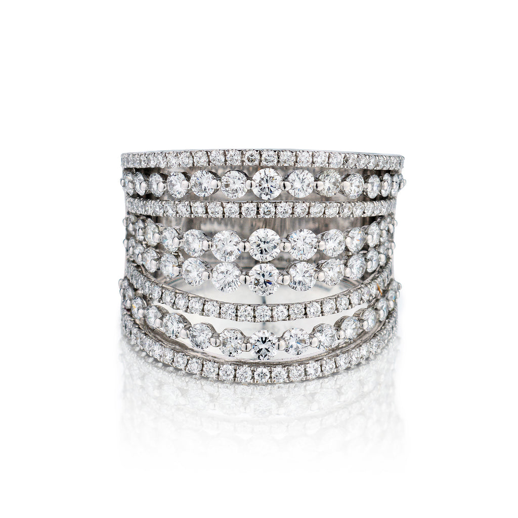 18kt white gold diamond ring featuring 2.50 total carat weight of Brilliant cut diamonds of (VS) in clarity and (G-H) in colour. Convex. 18mm (W).Current finger size: 7-1/4. This ring can be resized.