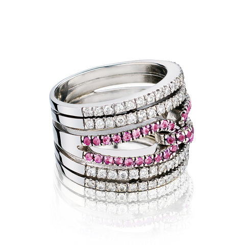 • 18kt White Gold Pink Tourmaline and Diamond Wide Band.