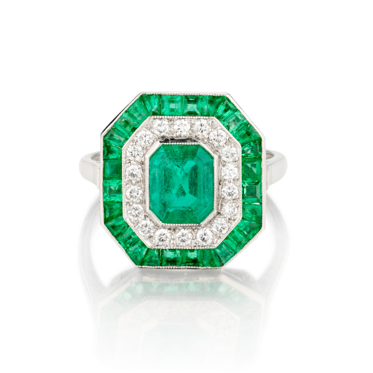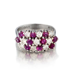 Ladies 18kt white gold Ruby and Diamond ring featuring 9 x 0.90 total carat weight of Rubies. Also featuring 10 x 1.20 total carat weight of Brilliant cut diamonds of (I-1) in clarity and (G) in colour. Current finger size: 6. This ring can be resized. English markings. Circa 1950's