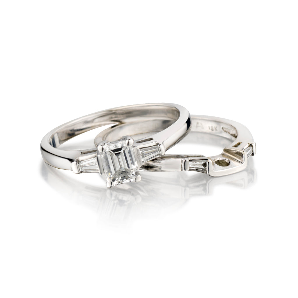 18kt white gold diamond wedding set. The engagement ring features an Emerald cut diamond weighing 0.50 carat weight of (SI) in clarity and (G) in colour. Accompanied by a 4 x 0.10 total carat weight of baguette cut diamonds. Current finger size: 7-1/2. This ring can be resized.