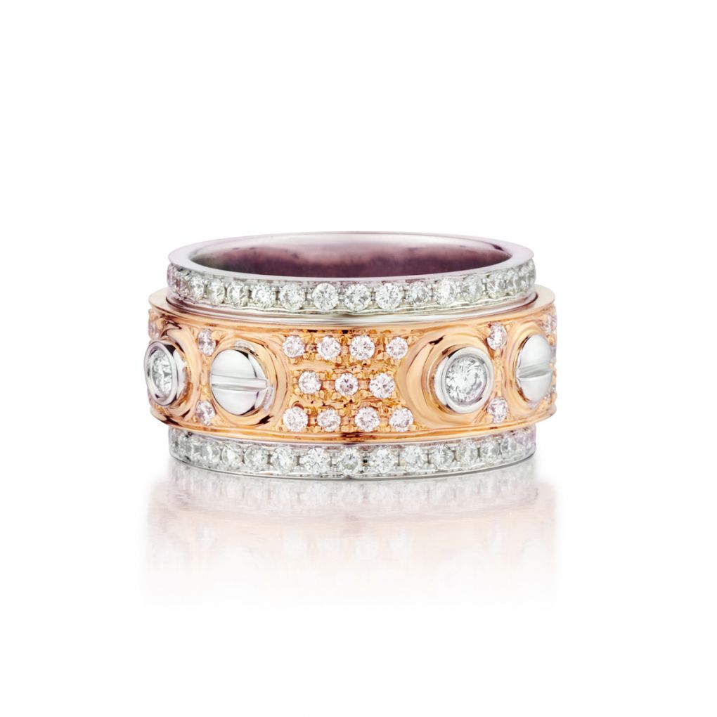 Ladies 18kt White and Rose Gold Diamond Band featuring 128 x 1.60 total carat weight of Brilliant cut diamonds of (SI) in clarity and (G) in colour. Diamonds are all the way around. Rose gold centre movable. Width:11mm. Weight:13.38 grams. Current finger size 7. This ring cannot be resized.