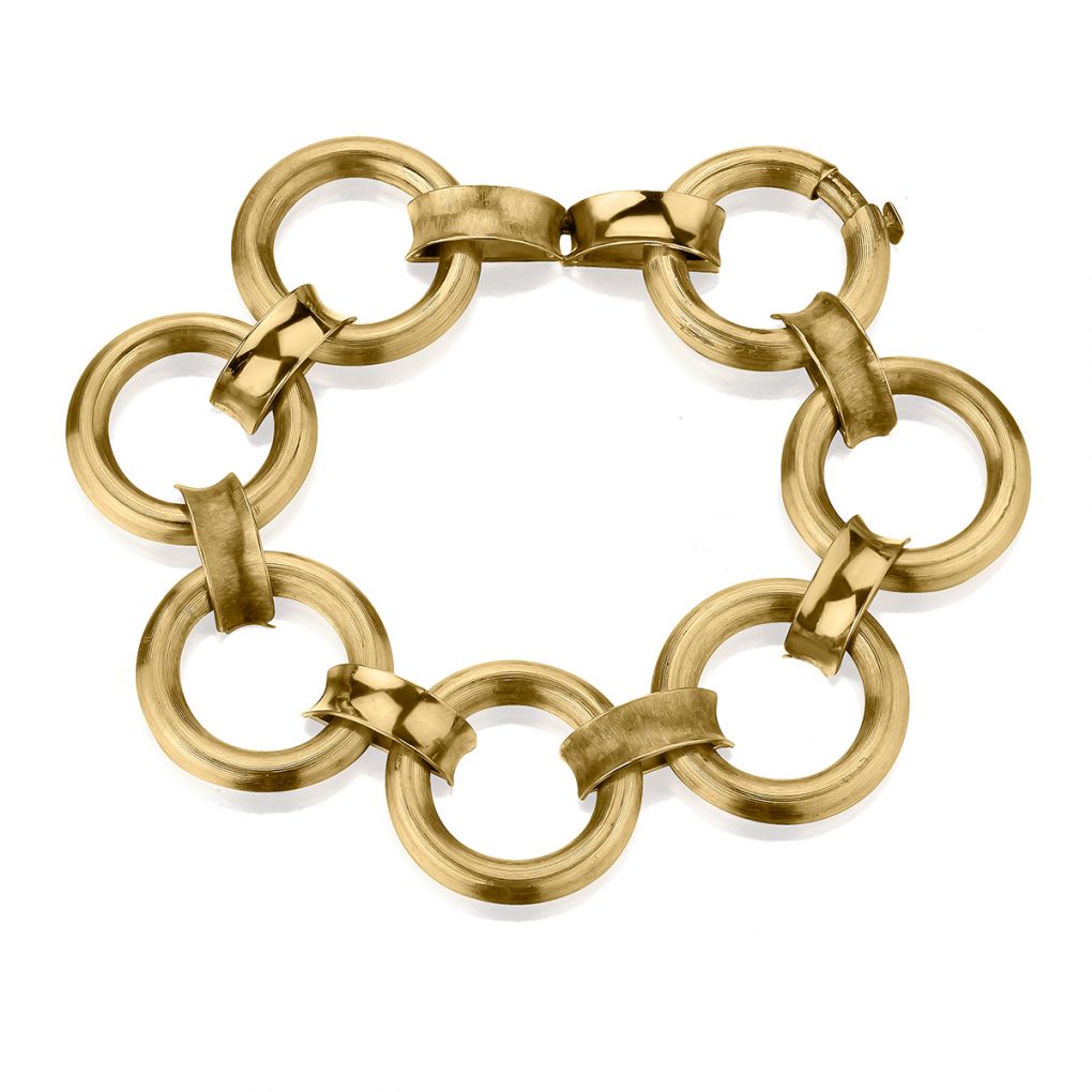 Ladies 18kt yellow gold bracelet featuring large circular rings. 24mm in width. 35.8 grams in weight. 8" in length.