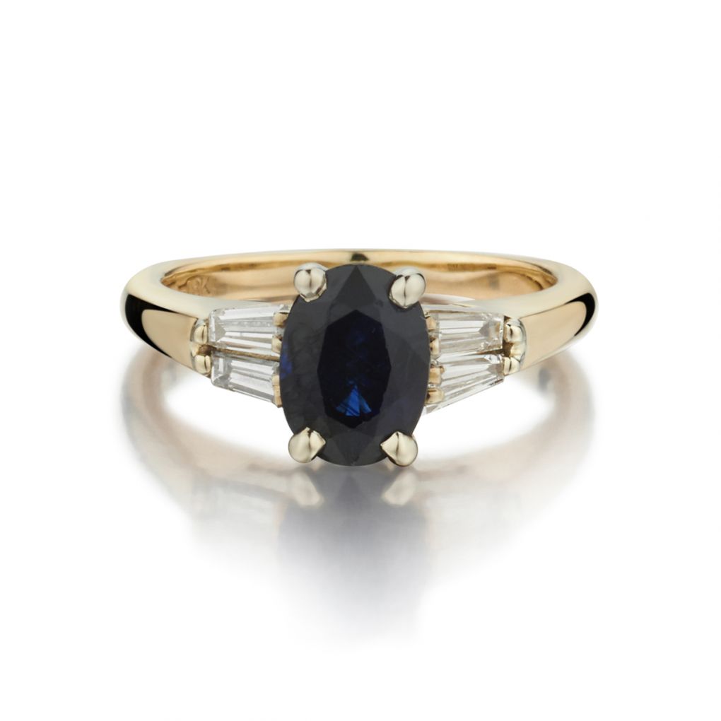 Ladies 14kt yellow gold and 18kt white gold dress ring featuring a 2.00 carat Oval-shaped sapphire of (Very dark tone of slightly violetish blue) color and heavily included clarity. Further enhanced by 4 tapered baguette diamonds weighing 0.40 carat total weight of (VVS) in clarity and (F-G) in color. Currently a finger size 5 but can be resized.