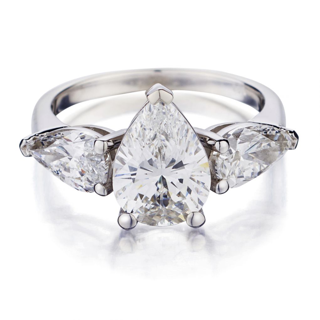 Ladies magnificent 18kt white gold three stone ring featuring a 2.01 carat Pear-shaped diamonds of (VVS) in clarity and (F) in color. The center-stone is flanked between (2) Pear-shaped diamonds weighing approximately 1.45 carat total weight of (VS) in clarity and (F) in color.