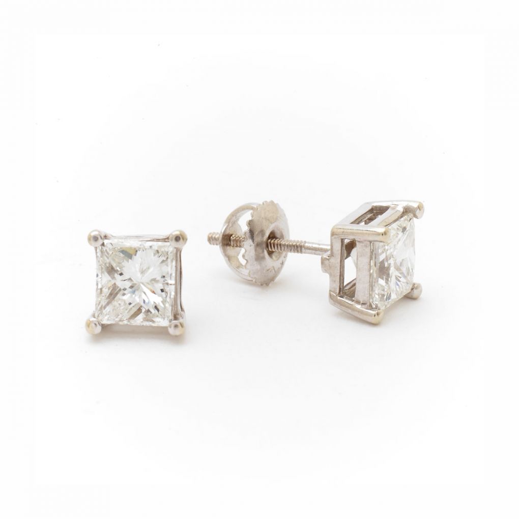 Ladies 14KT white gold pair of diamond studs featuring (2) Princess-cut diamonds weighing 2.07 carat total weight of (SI) in clarity and (G) in color.