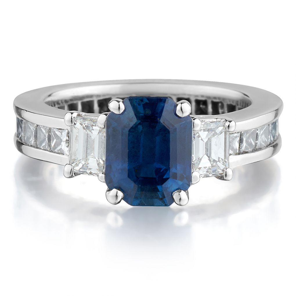 Ladies 18kt white gold ring featuring a 2.50 carat rectangular blue sapphire. 2 x 0.80 carat total weight of emerald cut diamonds of (VS) in clarity and (G) in color. 26 x 1.30 carat total weight of round brilliant cut diamonds on the band going all the way around. Currently a finger size 6 1/2 and cannot be resized.
