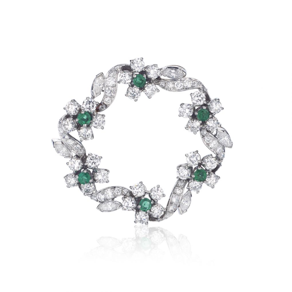 • 2.80 Carat Total Green Emerald And Diamond Floral Brooch