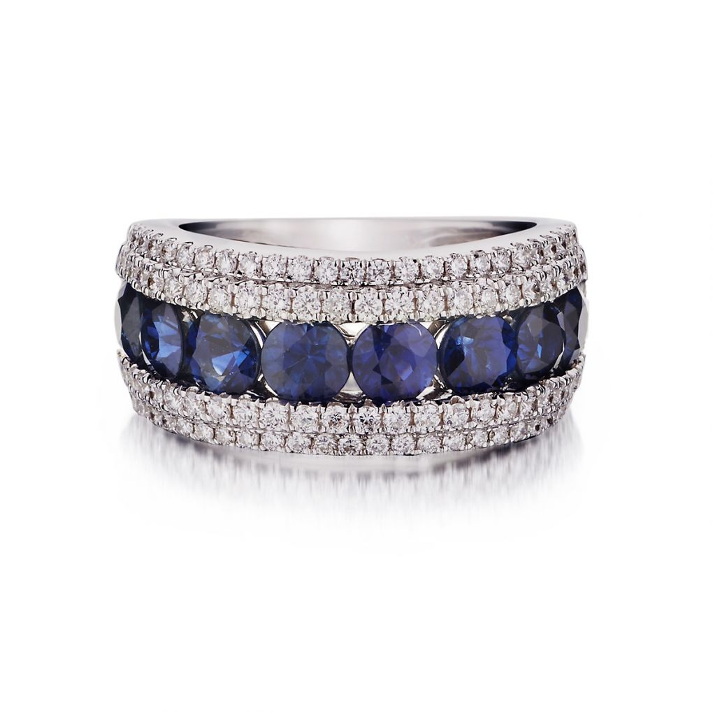 Ladies beautiful 18kt white gold diamond and sapphire ring featuring a row of (8) Round Blue Sapphires weighing 2.80 carat total weight. The row of sapphires is flanked between a double row of pave-set Round Brilliant cut diamonds weighing 0.70 carat total weight of (VS-SI) in clarity and (G) in color. Currently a finger size 6 3/4 but can be resized.