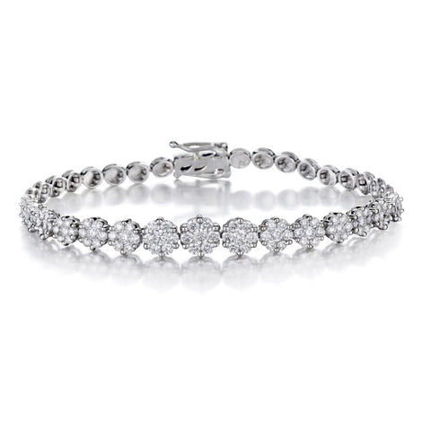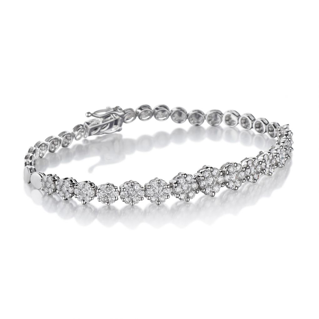 Ladies 18kt white gold diamond bracelet featuring 3.00 carat total weight of Round Brilliant cut diamonds of (VS) in clarity and (G) in color. Tapering bracelet with diamond clusters. 7 1/4" in length. 13 grams in weight.