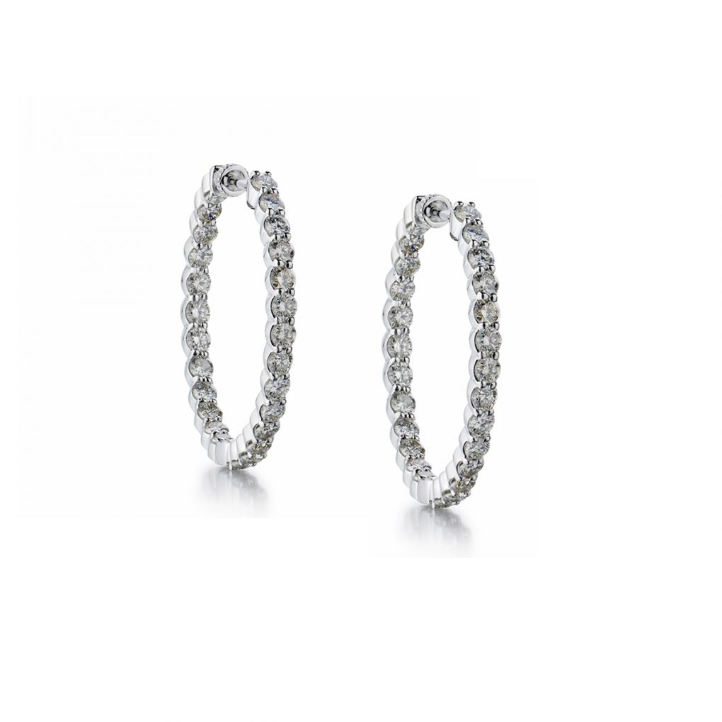 Ladies 14kt white gold diamond hoop earrings set with 3.00 carat total weight of Round Brilliant cut diamonds of (SI) in clarity and (G) in color. Hinged. All the way around. Diamonds inside and outside. 32mm diameter.