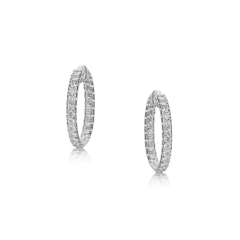 Ladies 18kt white gold diamond inside-out hoop earrings featuring 3.70 carat total weight of pave-set Round Brilliant cut diamonds of (SI) in clarity and (G-H) in color. Oval in shape. 13.6 grams in weight. 30mm (l) x 4m (w),