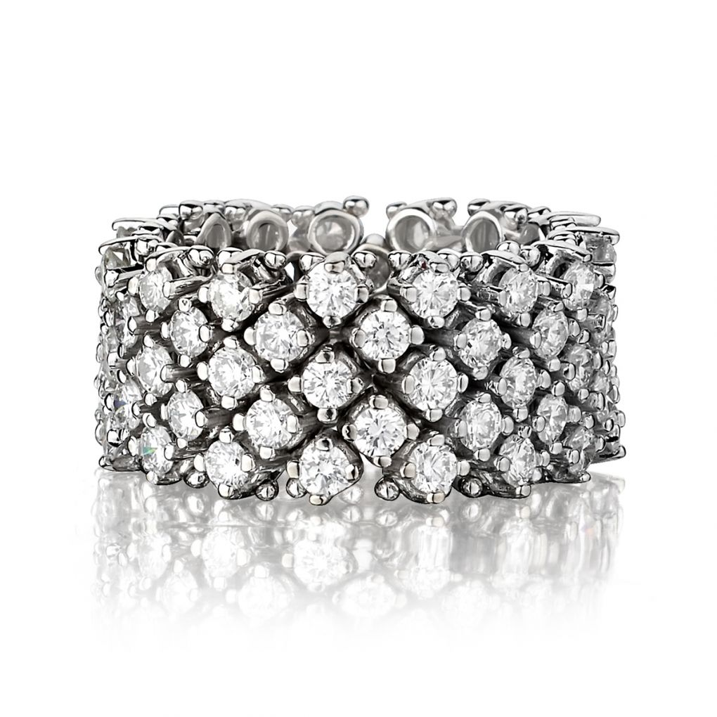 Ladies 18kt white gold mesh/flexible 5 row diamond ring featuring 3.75 carat total weight of Round Brilliant cut diamonds of (VS) in clarity and (G) in color. Size 6 3/4 but can be resized. 10.5mm (w).
