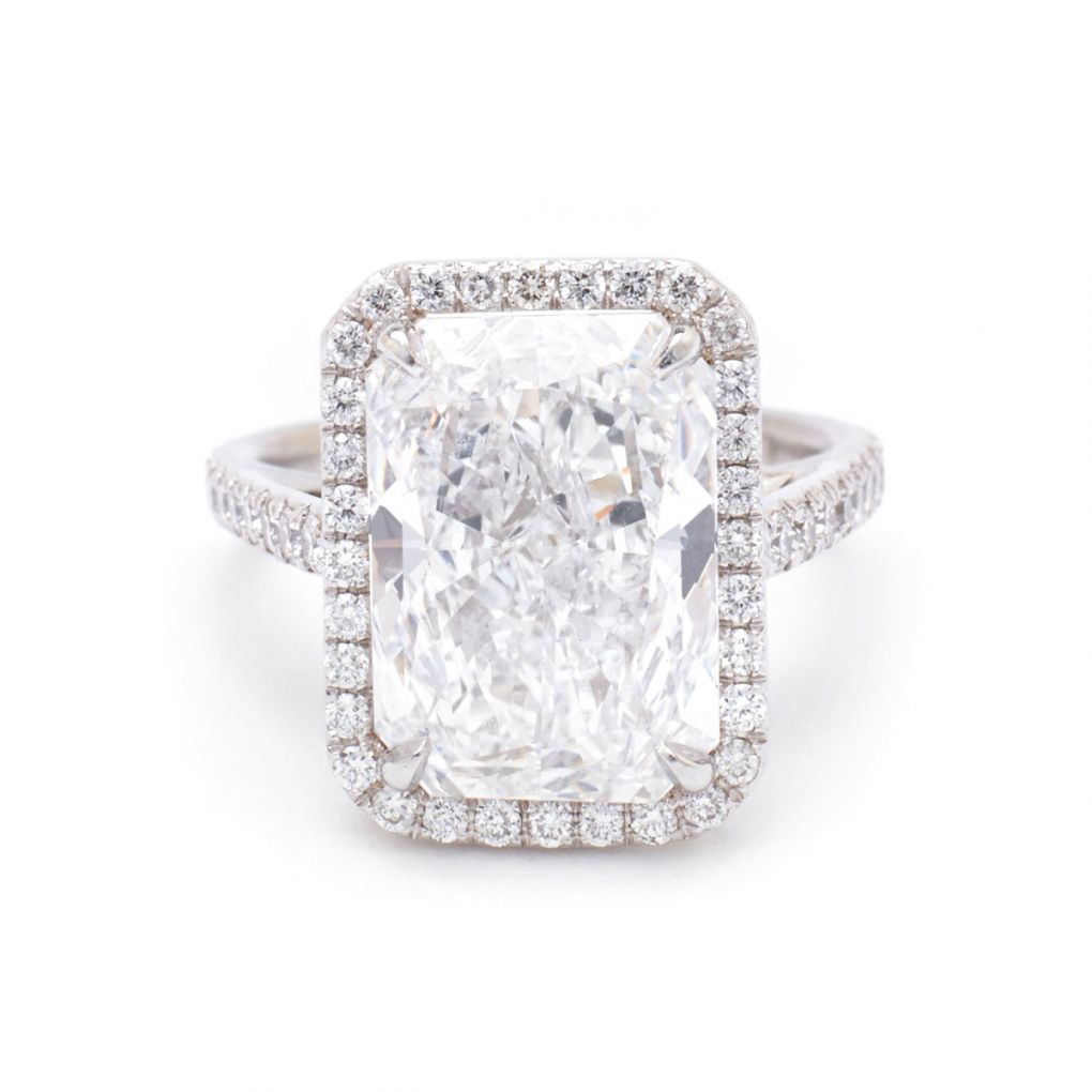 Ladies platinum halo-set engagement ring featuring a 5.10 carat Radiant cut diamond of (SI-1) in clarity and (D) in color. Also featuring approximately 1.05 total carat weight of round brilliant-cut diamonds on the mount.