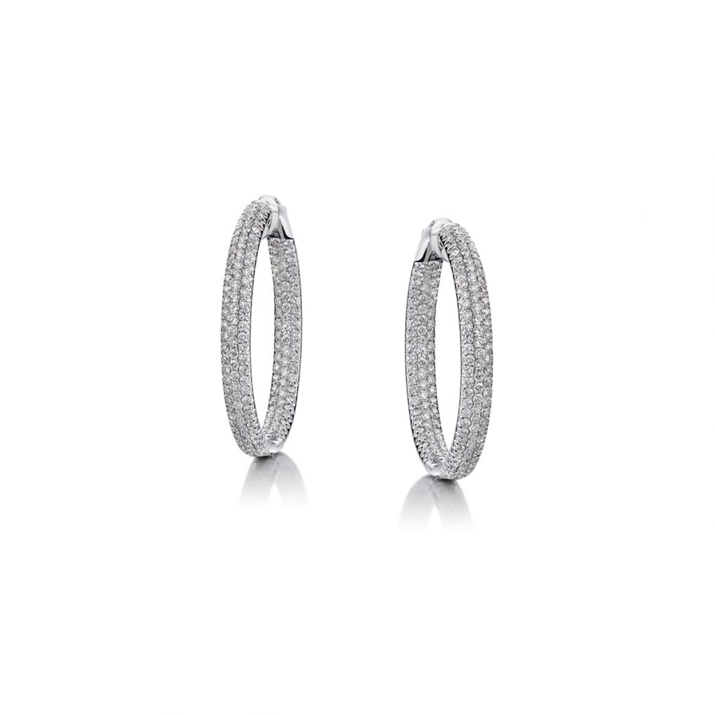 Ladies 18kt white gold diamond hoop earrings featuring 5.25 carat total weight of pave-set Round Brilliant cut diamonds of (SI) in clarity and (G-H) in color.  Measuring :30mm (L) x 6mm(W). Interior diameter: 21mm.17.06 grams in weight.
