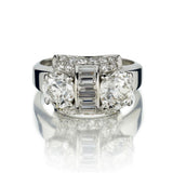 Ladies beautiful platinum art-deco diamond engagement ring featuring (1) Old-European cut diamond weighing 1.20 carat of (VS-1) in clarity and (J) in color. Also featuring (1) Old-European cut diamond weighing 1.00 carat of (VS-1) in clarity and (J) in color. Further enhanced by (29) baguette cut and single cut diamonds weighing 1.00 carat total weight. 8.3 grams in weight. 10mm l x 14mm w x 7mm h. French hallmarks. Currently a finger size 5 1/2 but can be resized. Circa 1930 (+/-).