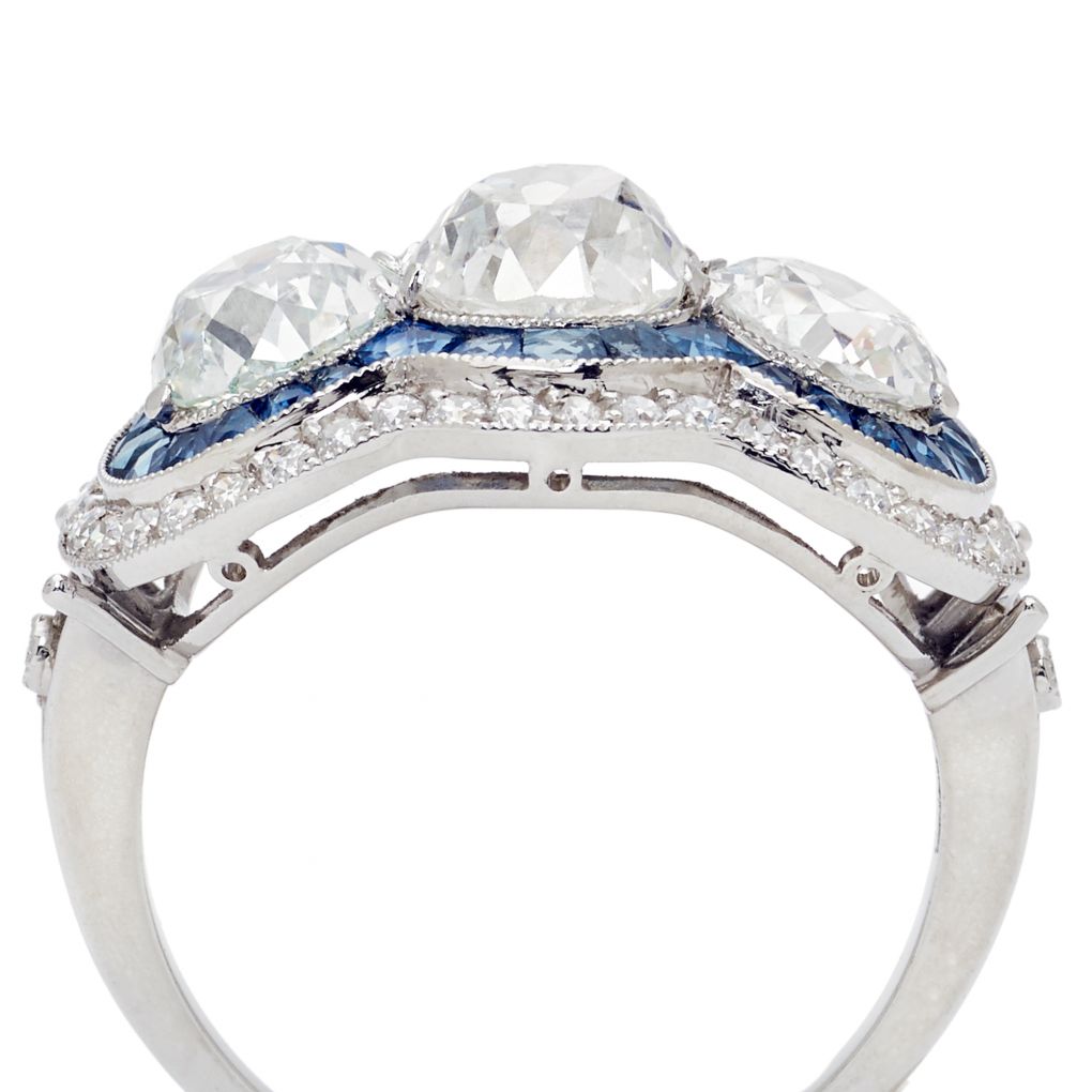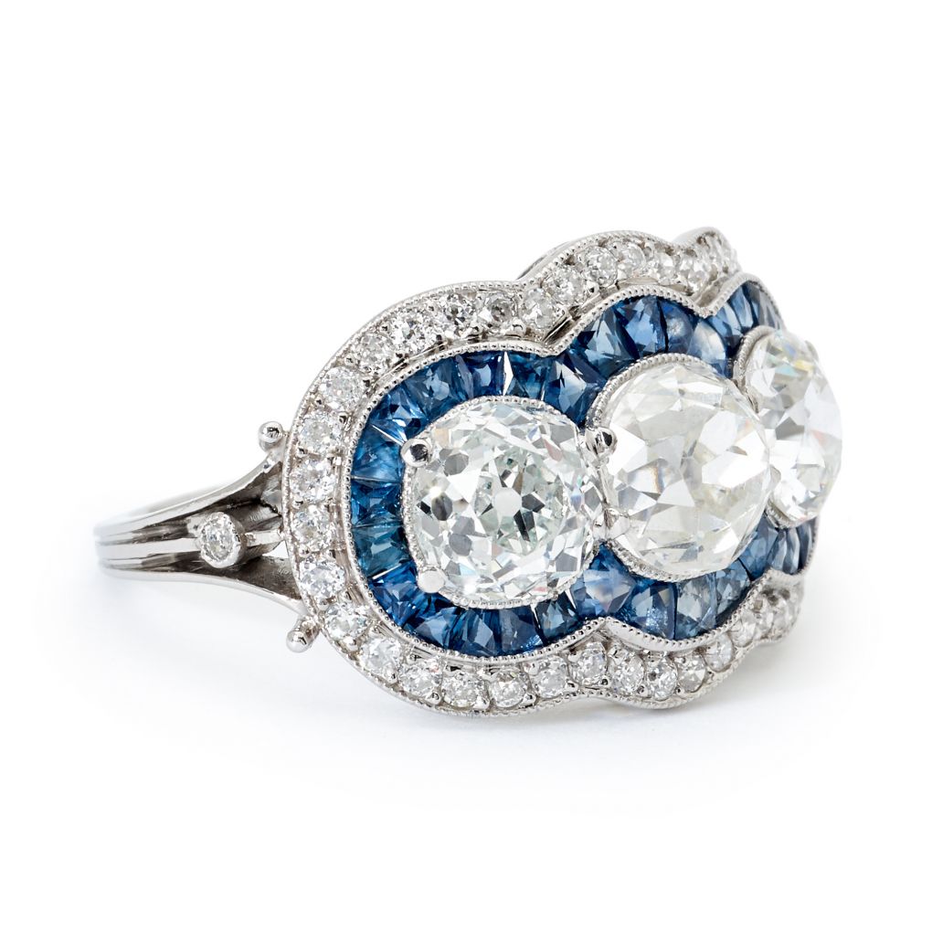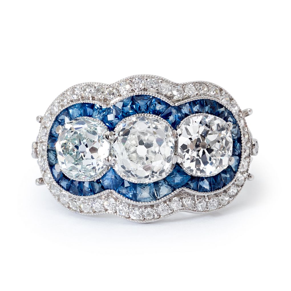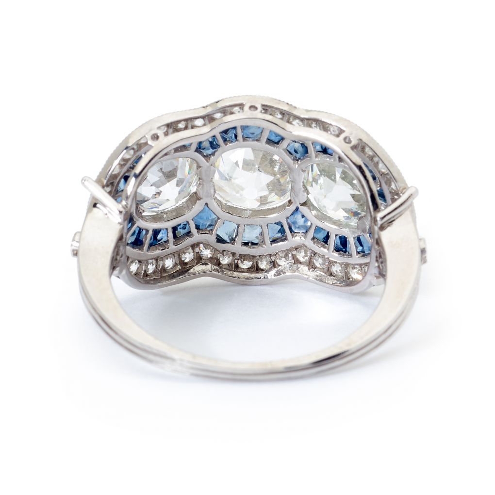Ladies magnificent platinum Art-Deco era diamond ring featuring (3) Old-Mine cut diamonds weighing approximately 3.65 carat total weight of (VS) in clarity and (H) in color. These (3) diamonds are encircled by approximately 1.50 carat total weight of untreated calibre-cut blue sapphires. The ring is further enhanced by a halo of Old-Mine cut diamonds weighing approximately 1.20 carat total weight. Circa 1920(+/-).